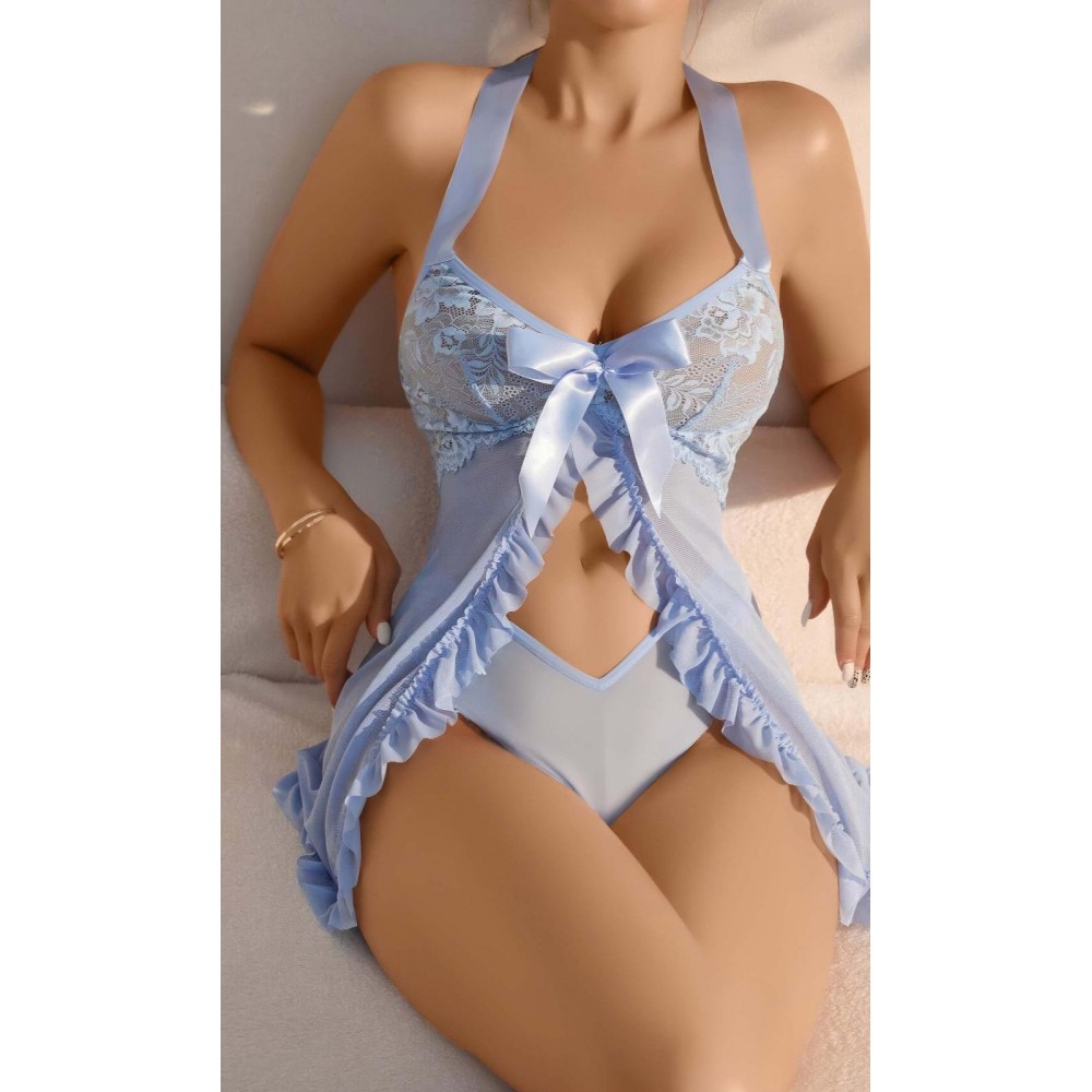 Kadın Bebe mavisi Fantezi Gecelik Tül Göğüs Fiyonk detaylı Dekolteli Önden Fırfırlı 2116 S/M