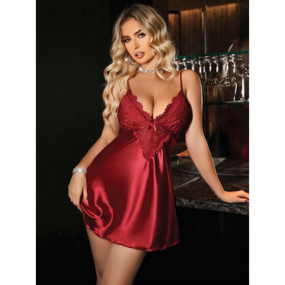 Kadın Kırmızı Saten Askılı Dantel Detaylı Gecelik 2227 S/M