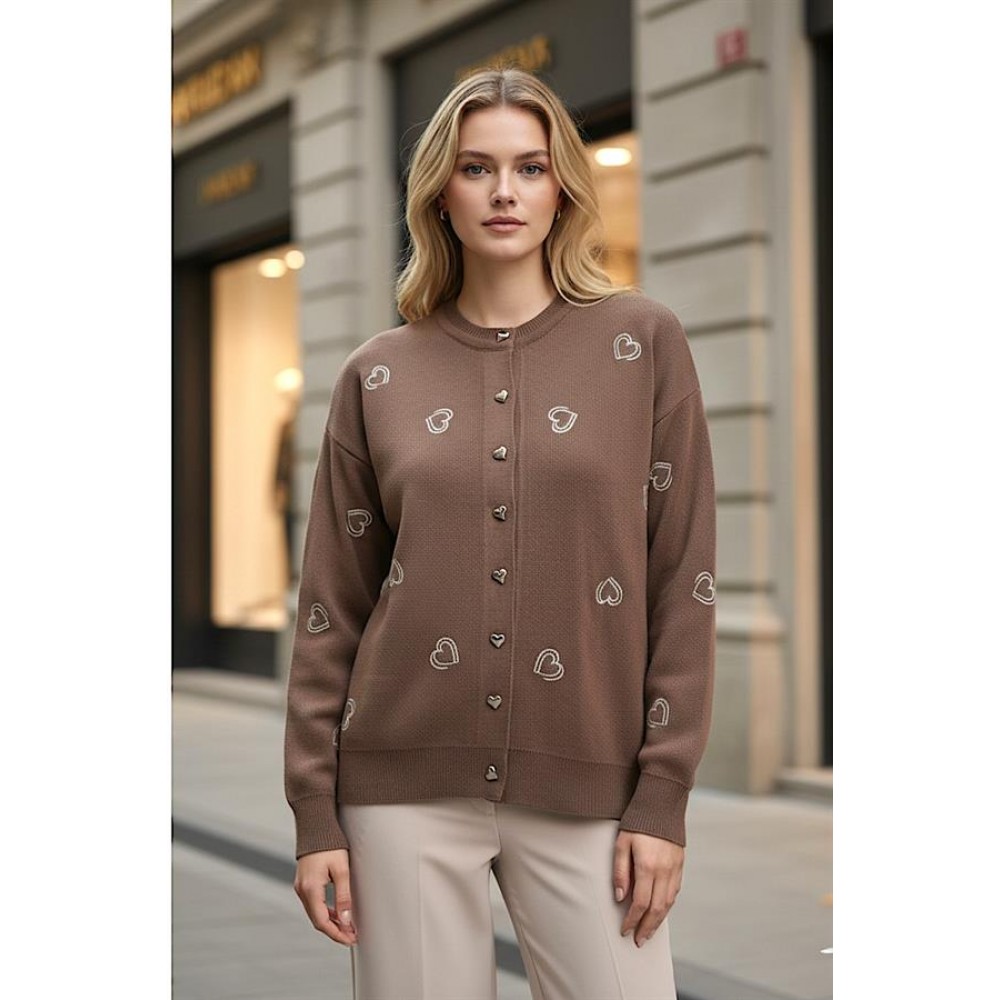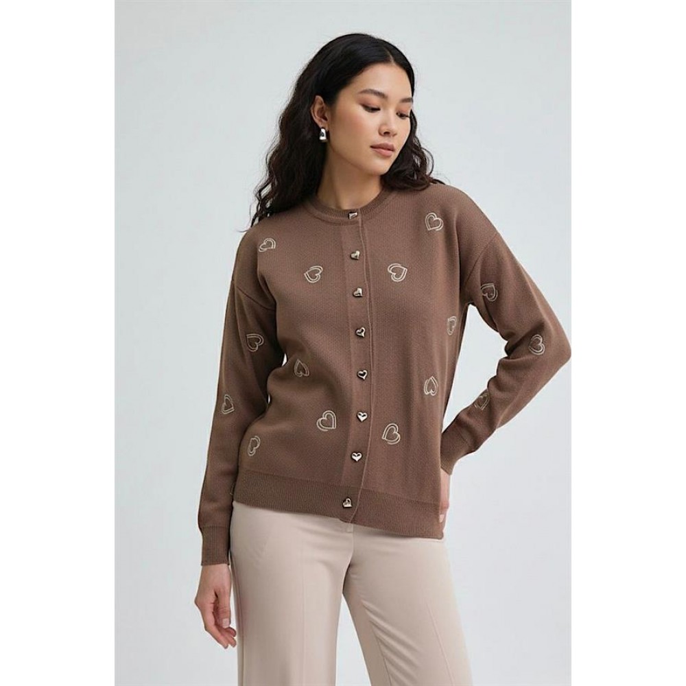 Kahverengi Kalp Nakışlı Düğmeli Triko Hırka