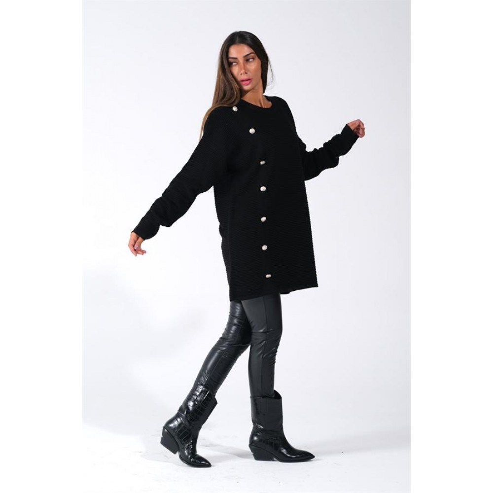 Siyah Bisiklet Yaka Fitilli Düğme Detaylı Triko Kazak Siyah TRWDGST3087