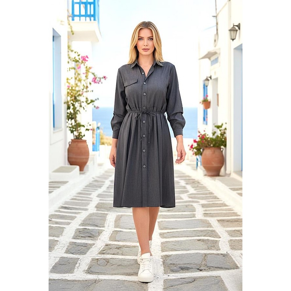 Antrasit Cep Detaylı Tensel Gömlek Elbise