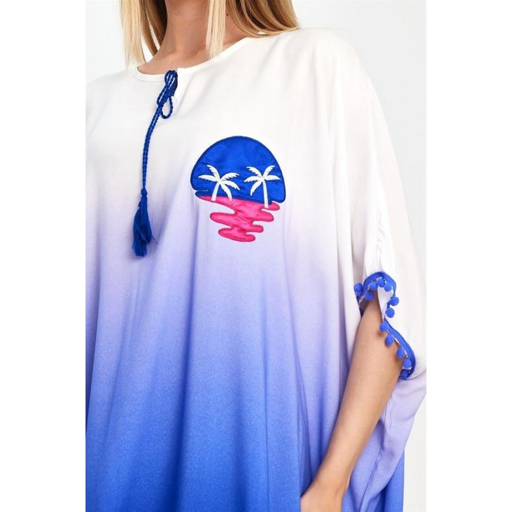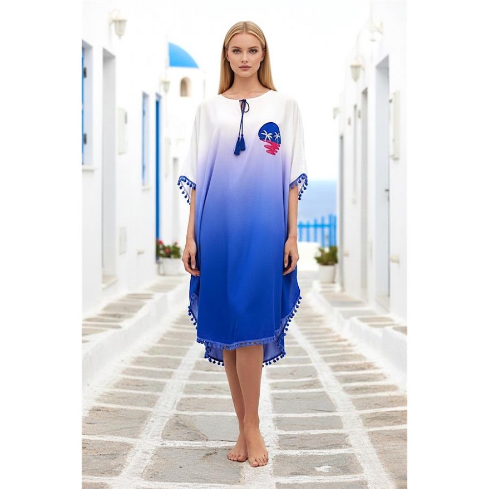 Mavi Aplike Nakışlı Yarasa Kol Ponponlu Kısa Elbise