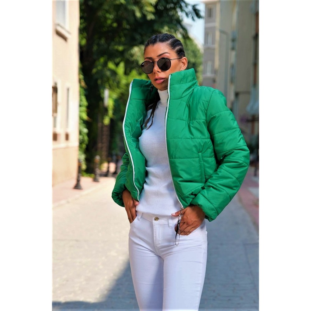 Çimen Yeşili Dik Yaka Su Geçirmez Kısa Şişme Mont Haki SMKBLYCYXKM005
