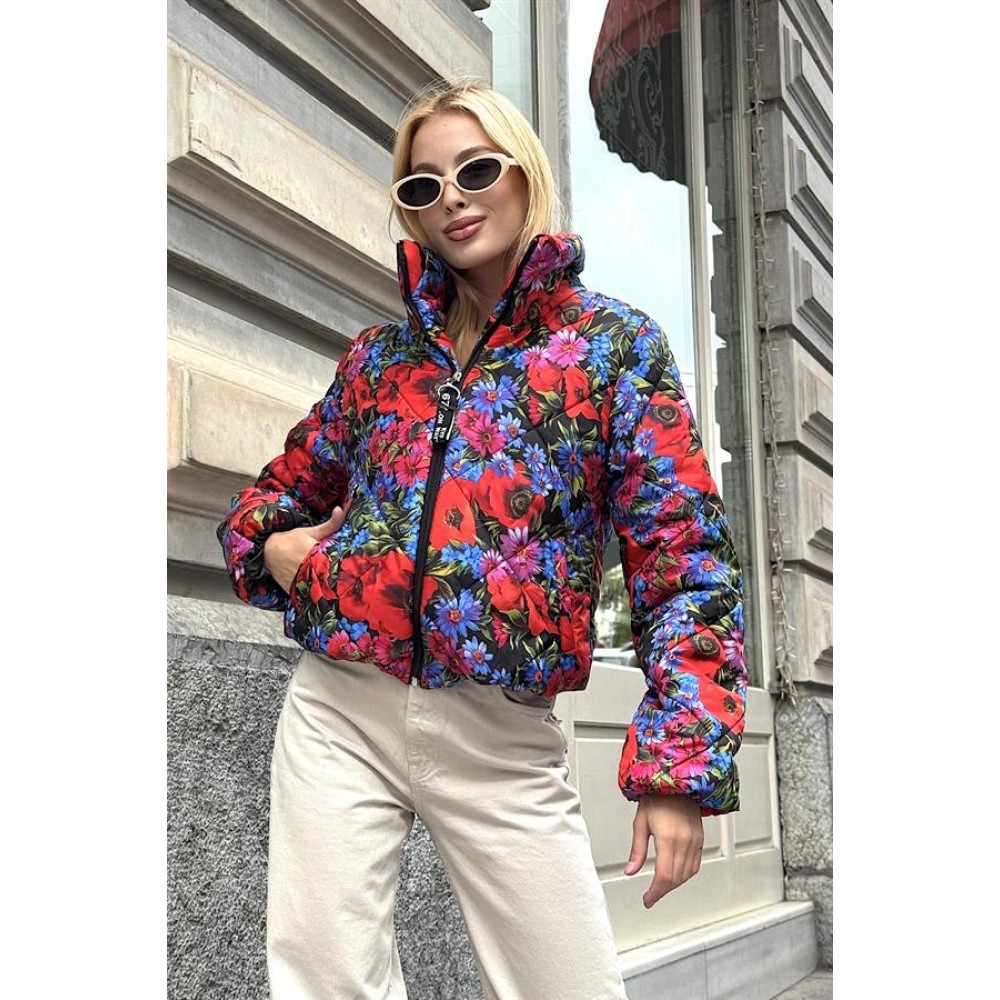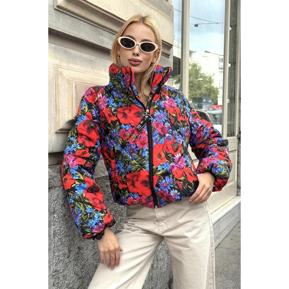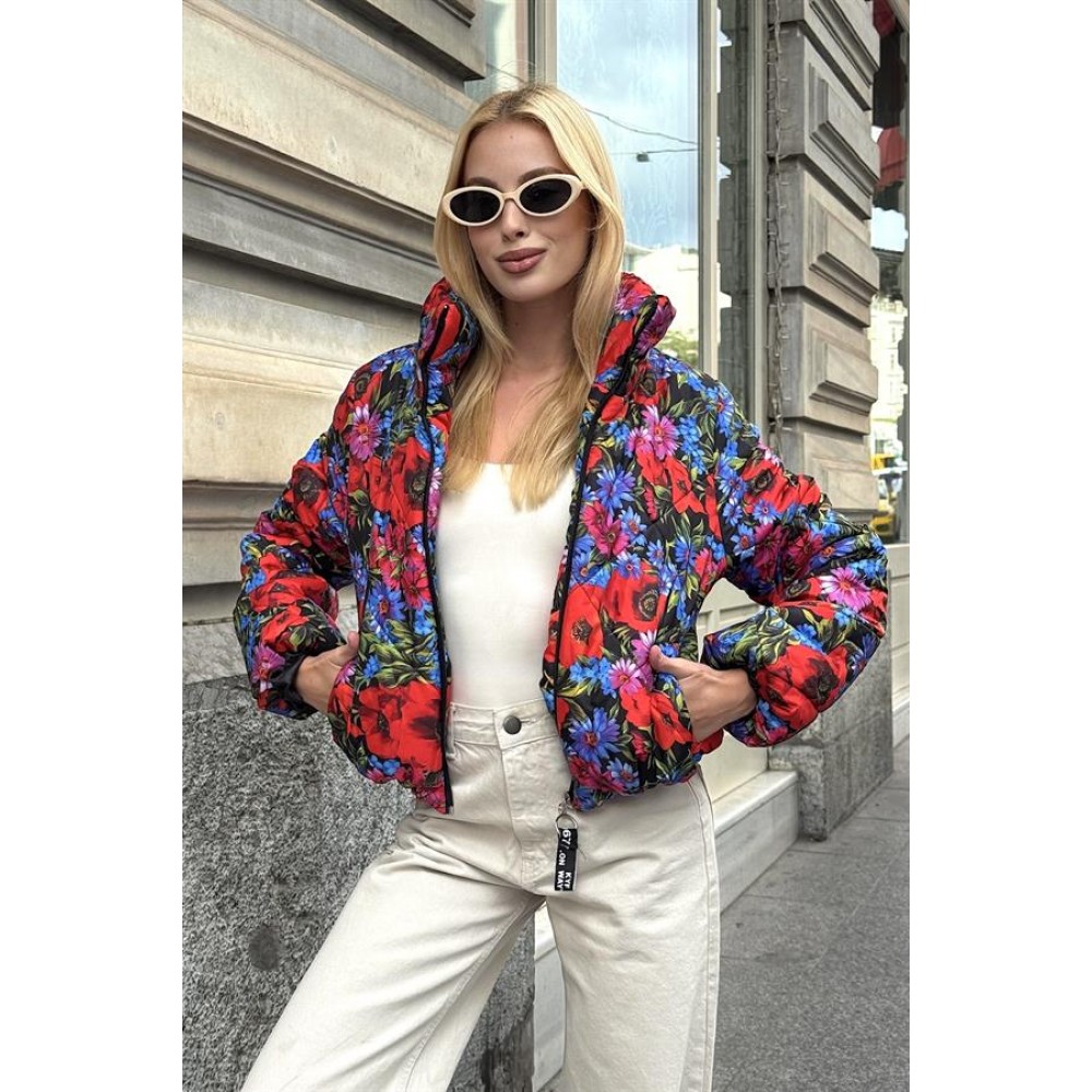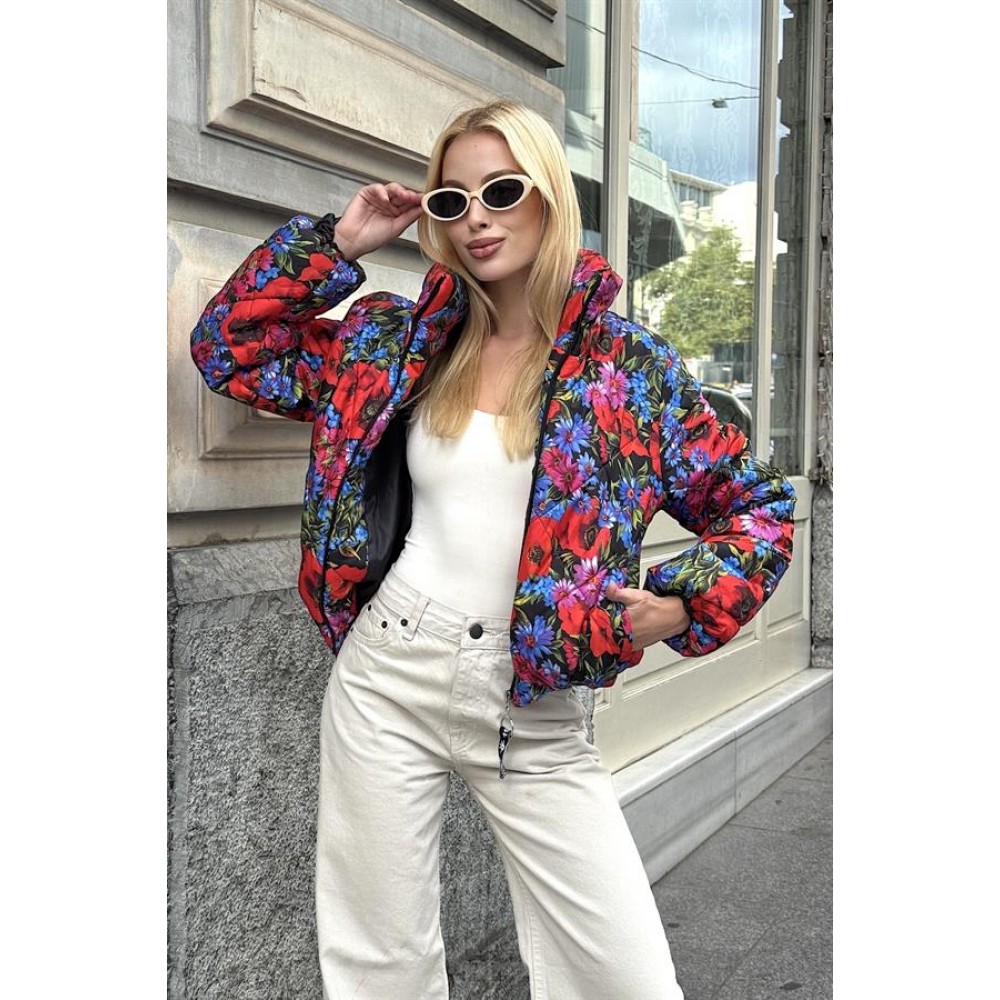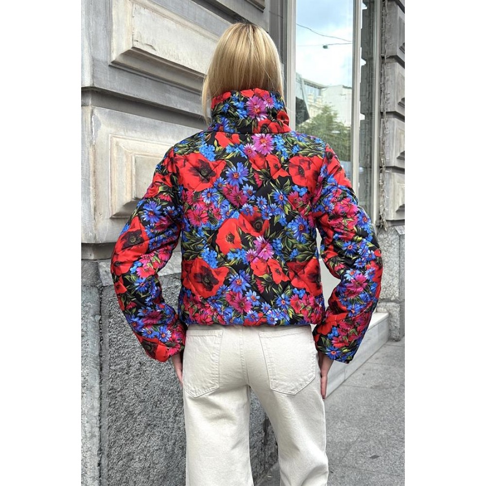 Mavi Dik Yaka Çiçekli Kısa Şişme Mont