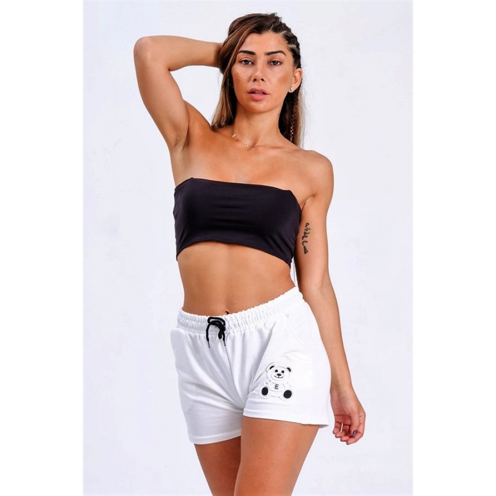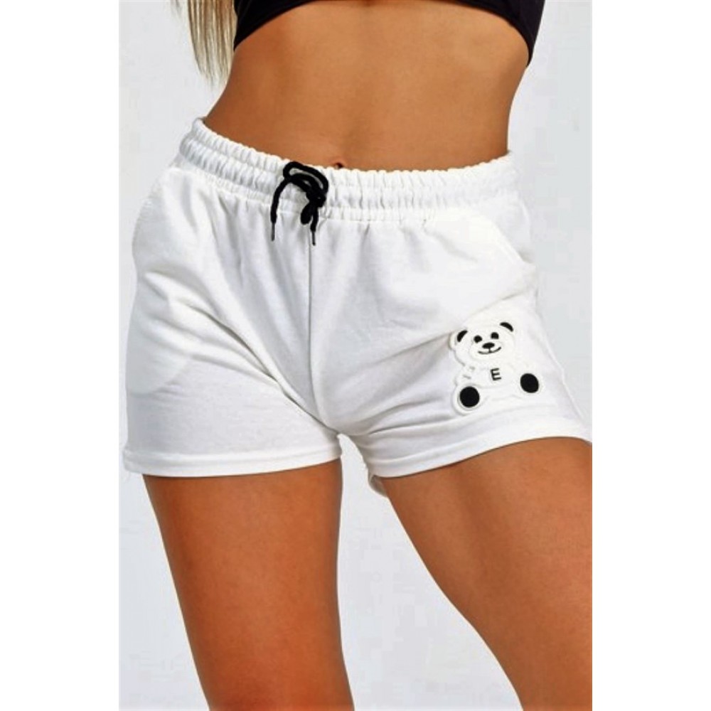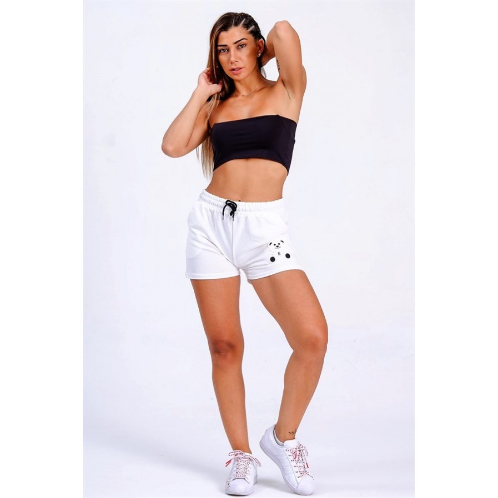 Beyaz Panda Baskılı Beli Lastikli Bağcıklı Cepli Pamuklu Şort