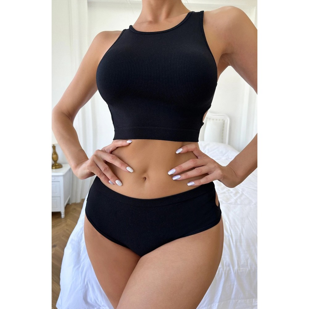 Kadın Siyah Sırt Dekolteli ve Boyundan Bağlamalı Yarım Kol Crop Top B…