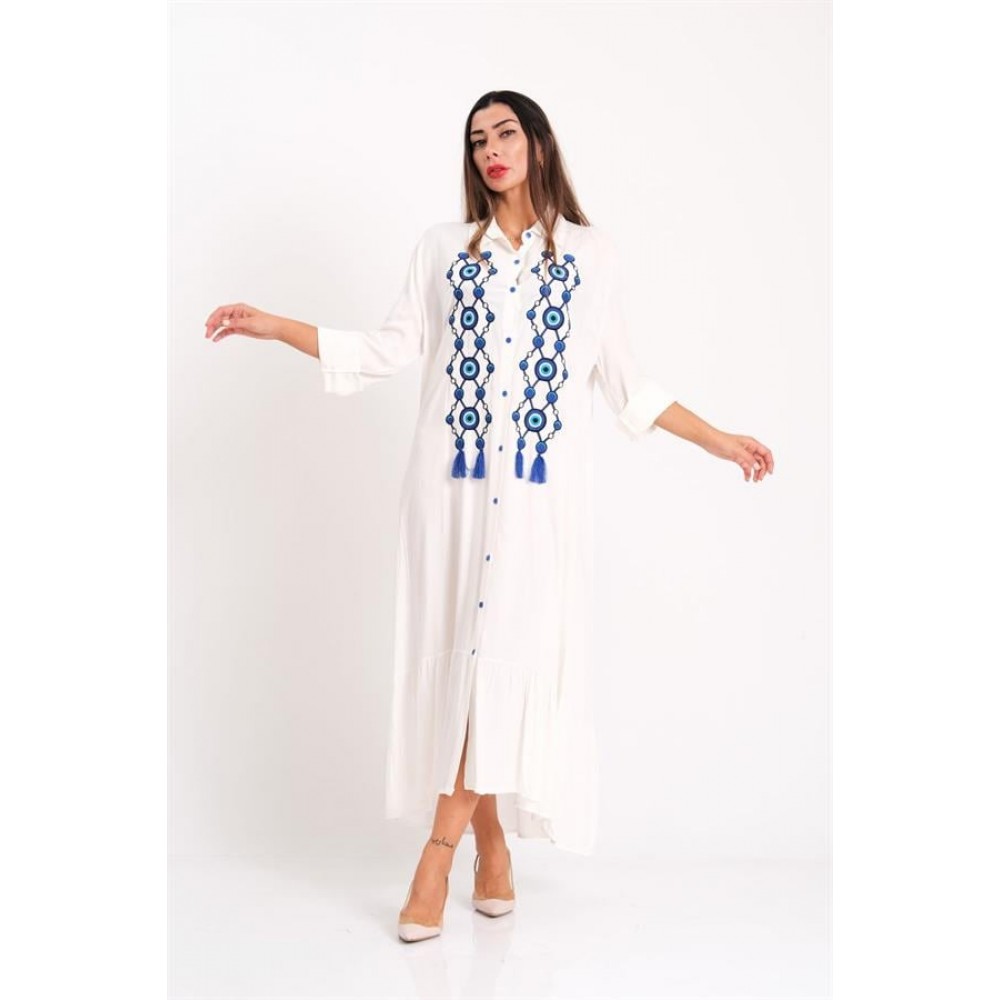 Beyaz Önü Nazar Boncuğu Nakışlı Püsküllü Kolu Apoletli Eteği Fırfırlı Uzun Gömlek Elbise
