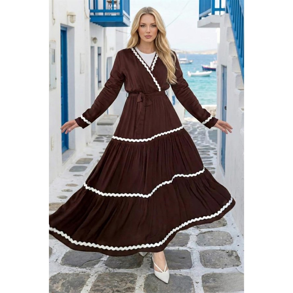 Kahverengi Kruvaze Yaka Kat Kat Uzun Elbise Kahverengi EUWKFKXV277