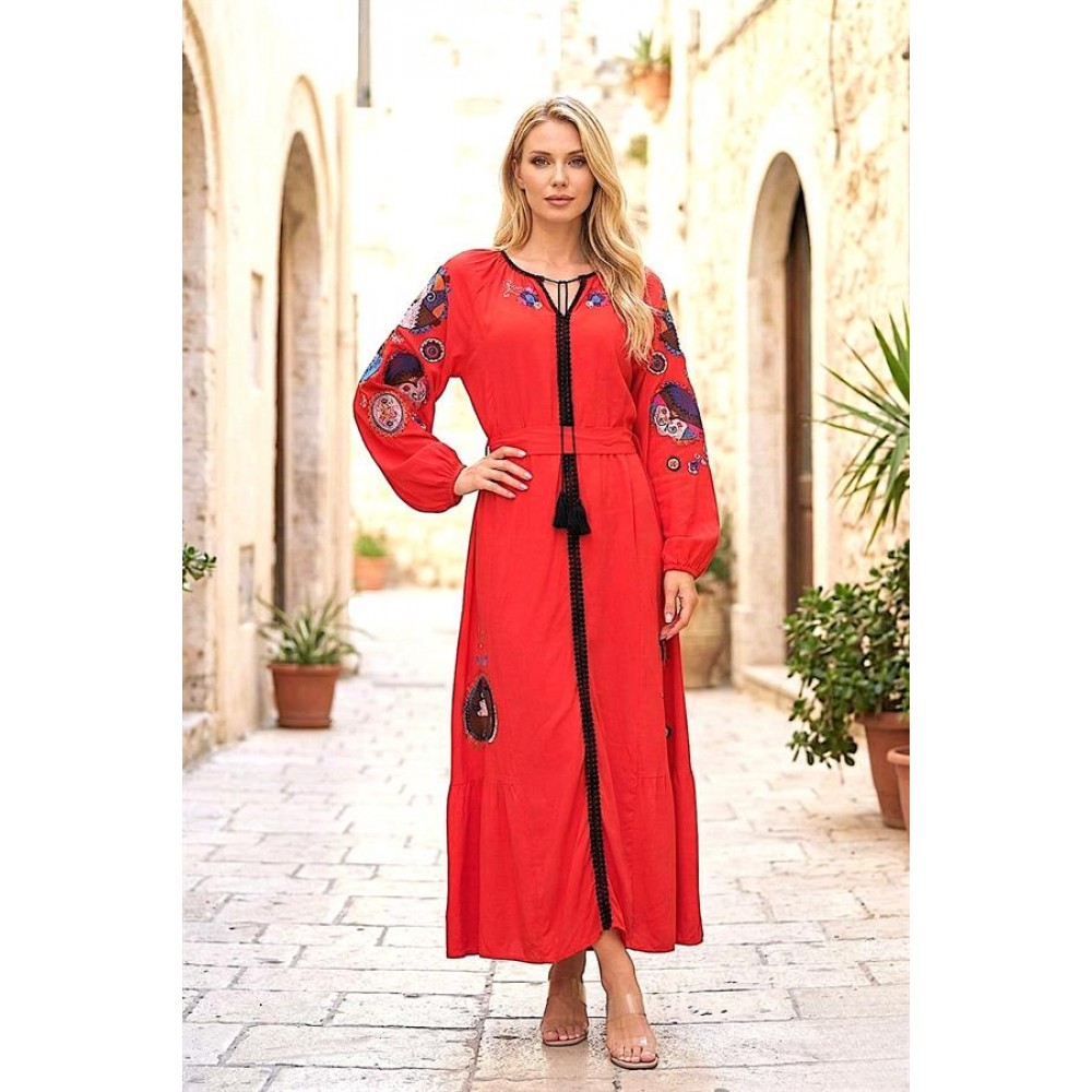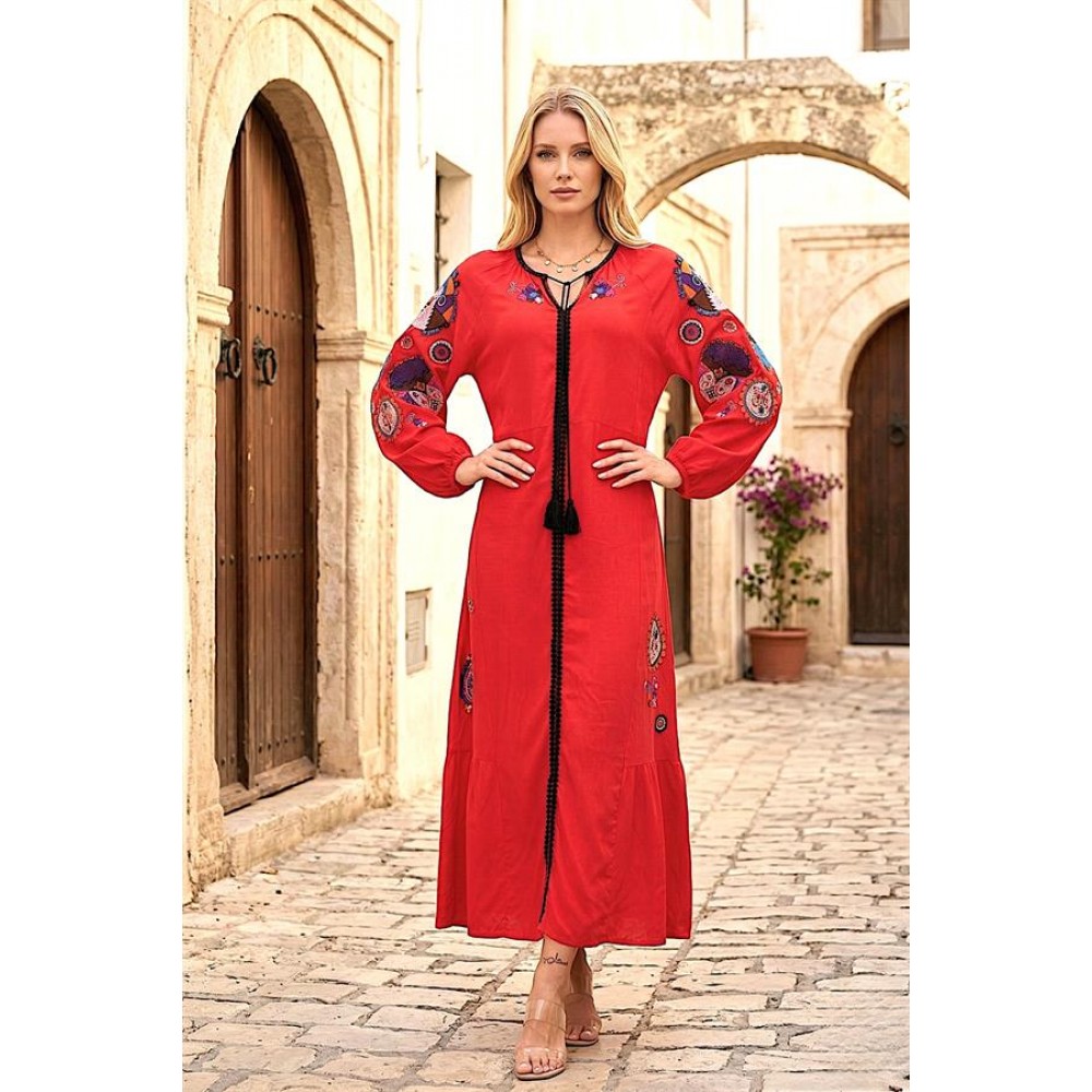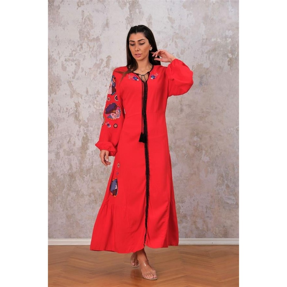 Kırmızı Boyundan Bağlamalı Önü Kolları Ve Eteği Nakışlı Kemerli Uzun Elbise Kırmızı