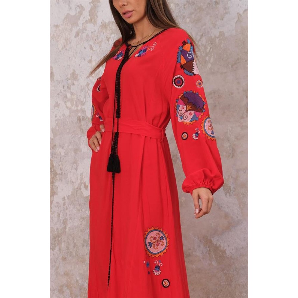 Kırmızı Boyundan Bağlamalı Önü Kolları Ve Eteği Nakışlı Kemerli Uzun Elbise Kırmızı EU2FNKX2843