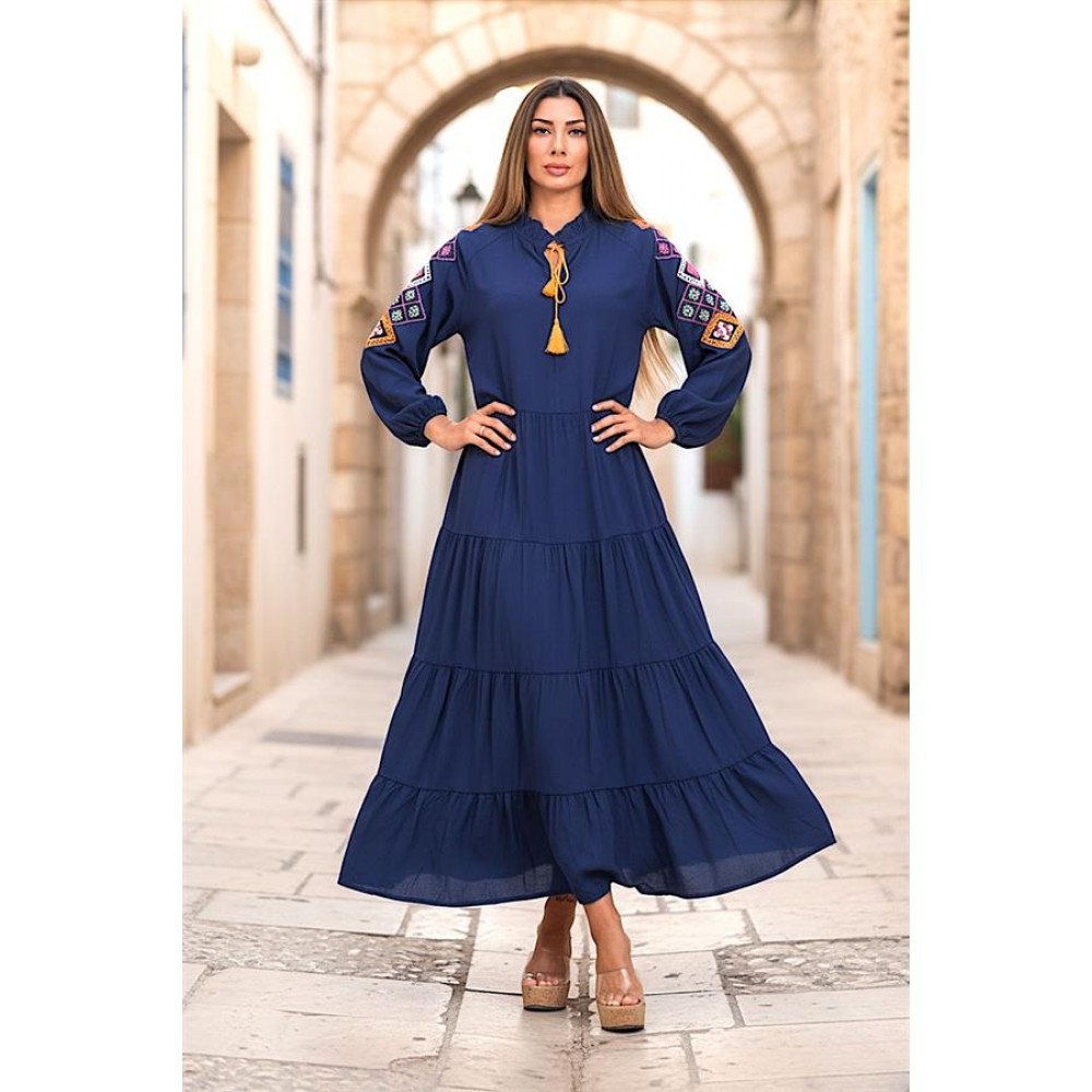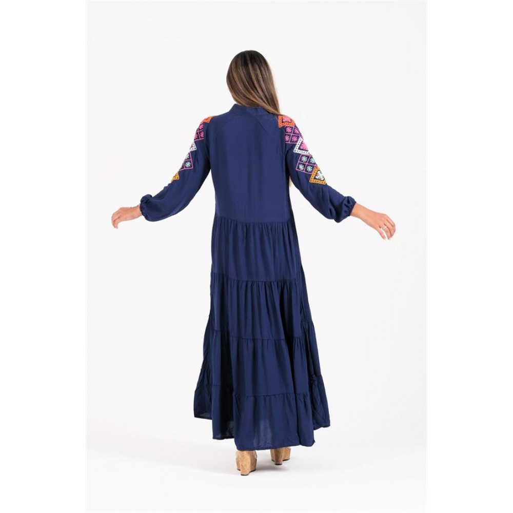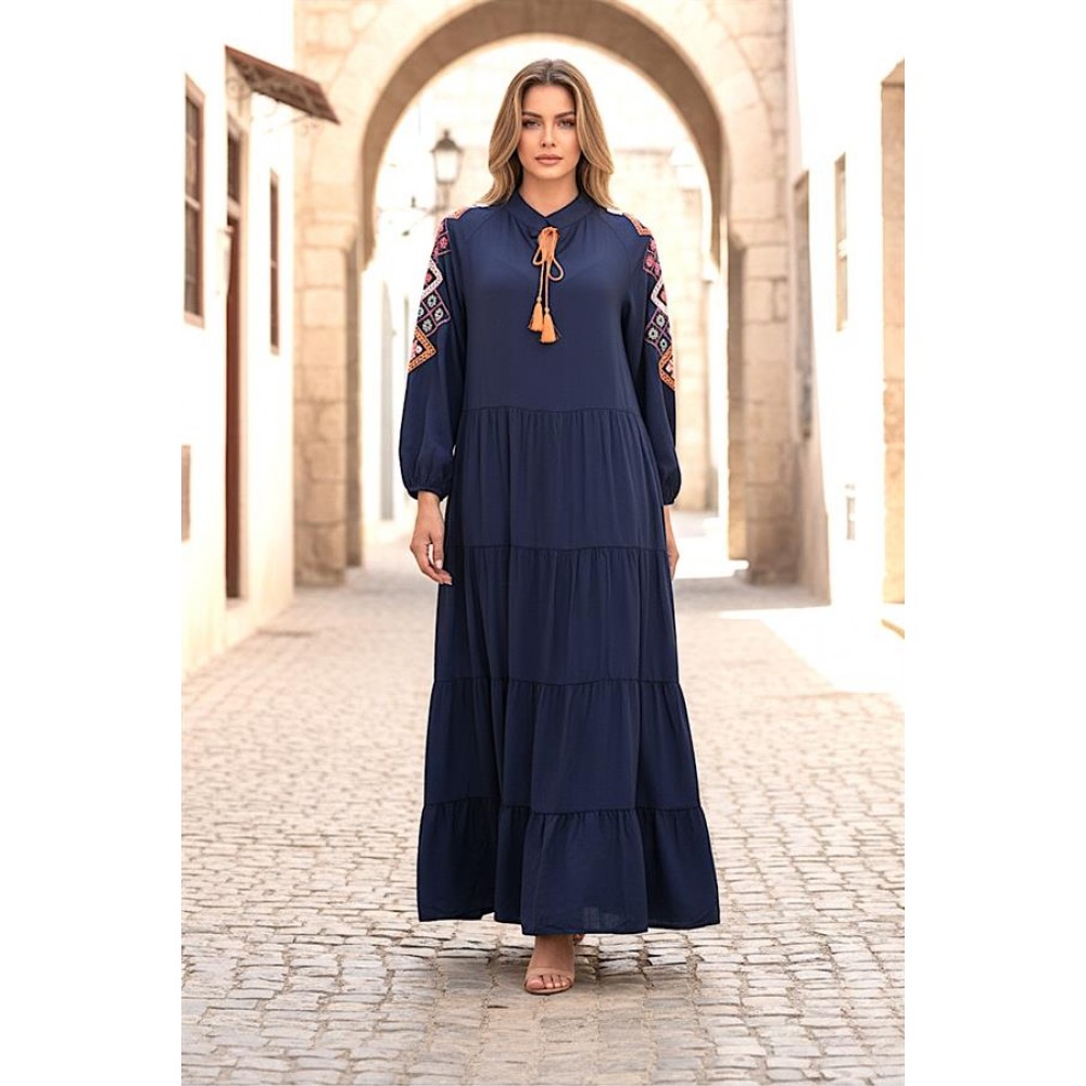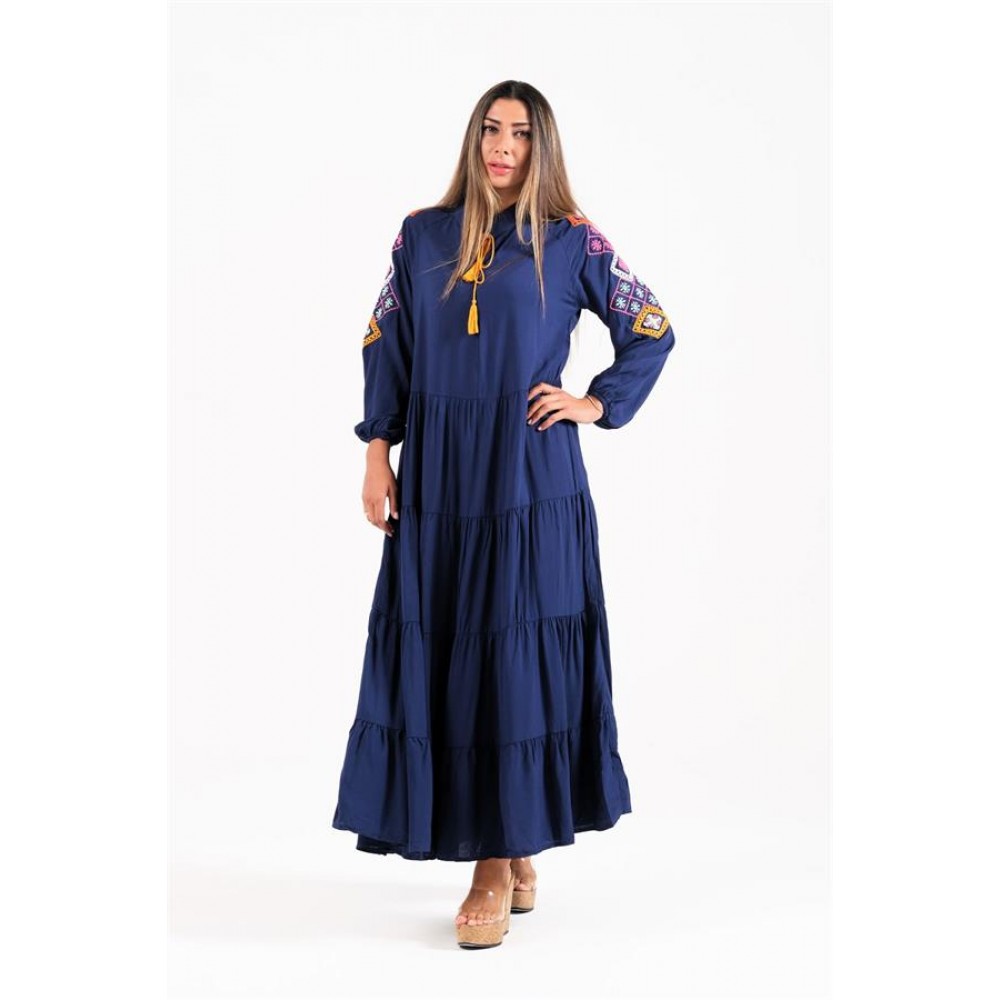 Lacivert Sıfır Yaka Kolları Nakışlı Eteği Kat Kat Uzun Elbise