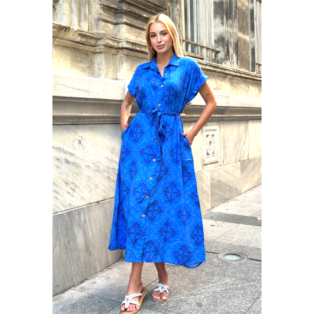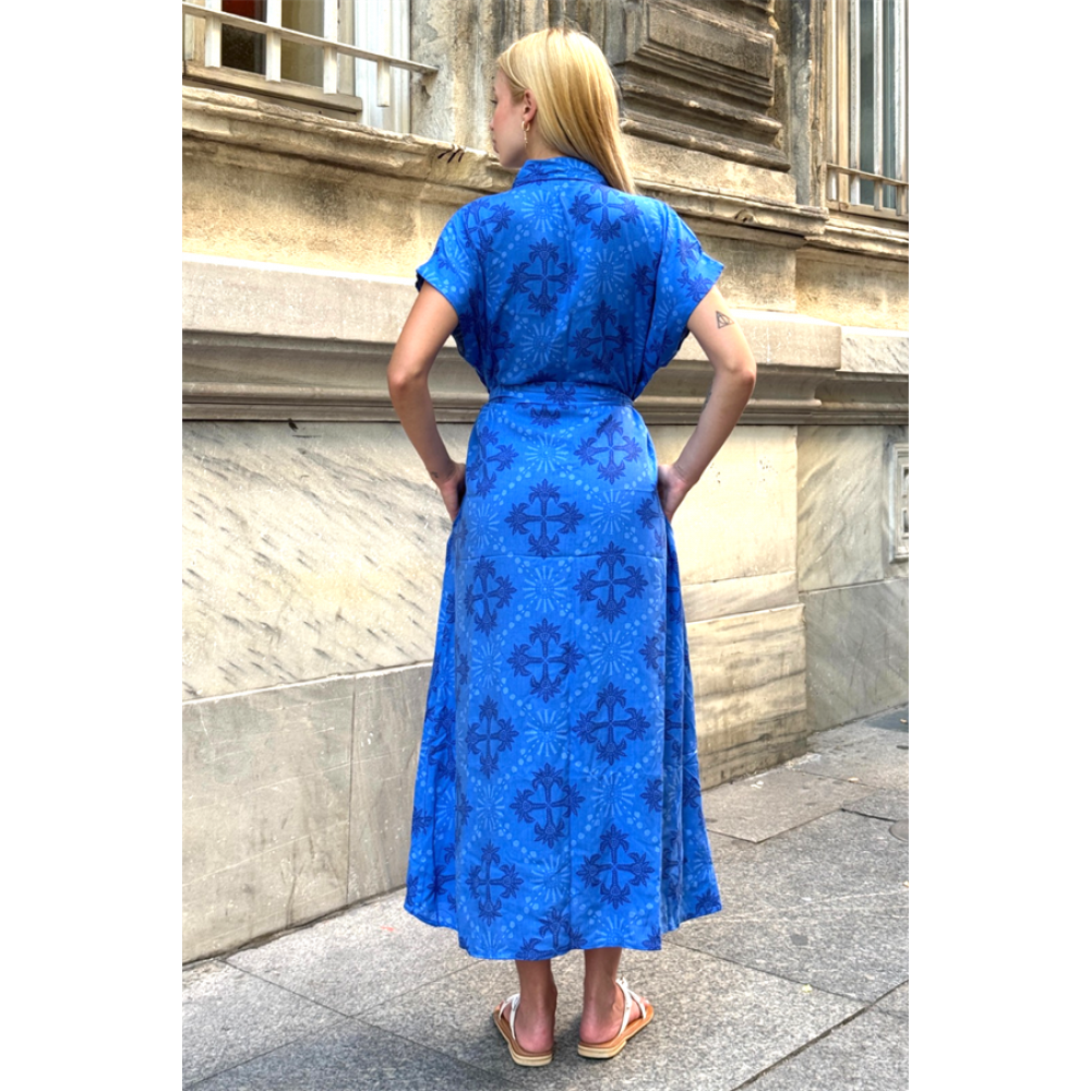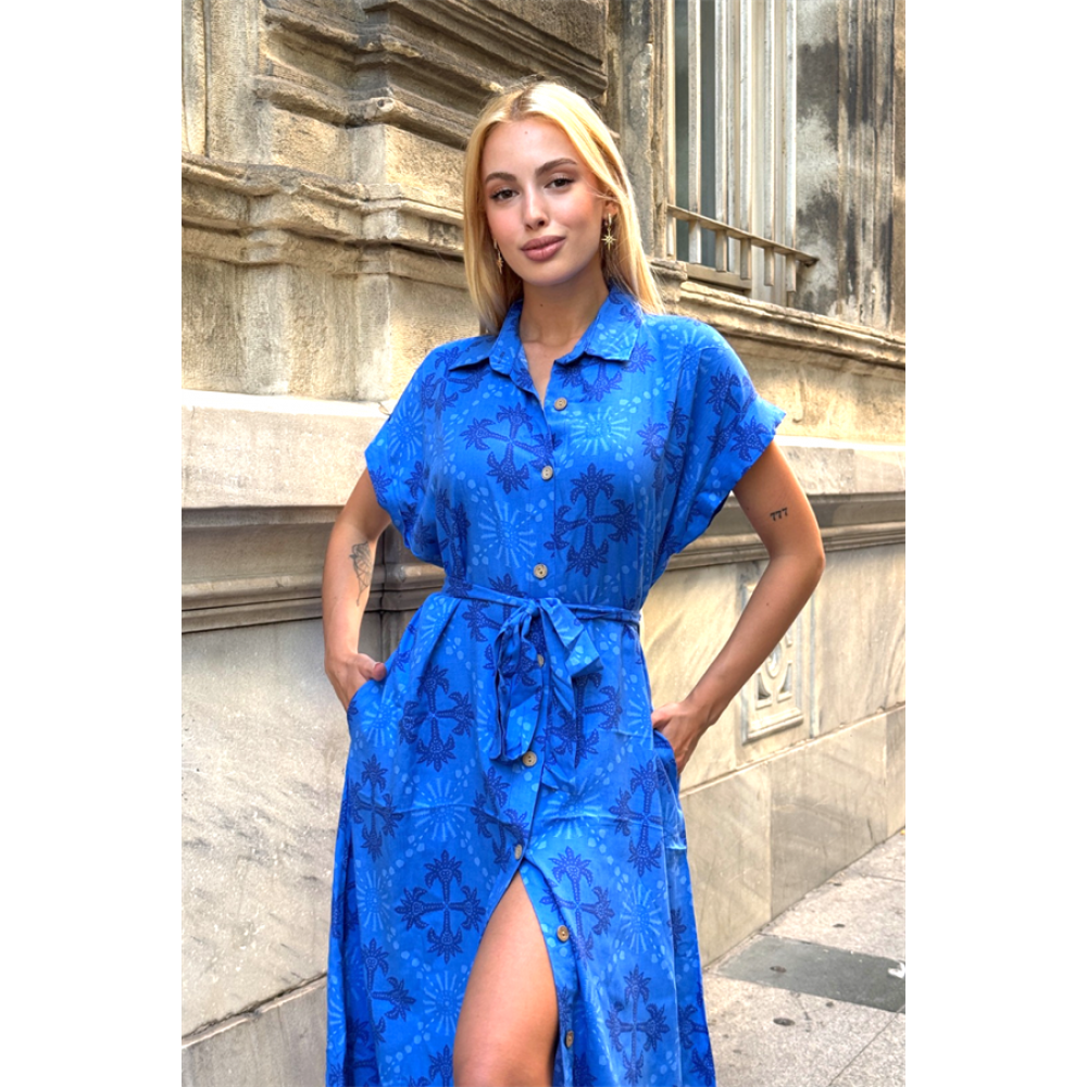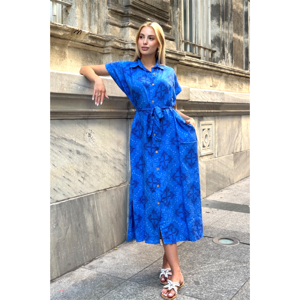 Saks Mavi Desen Garnili Göğsü Nakışlı Cepli Oversize Uzun Elbise Sak…