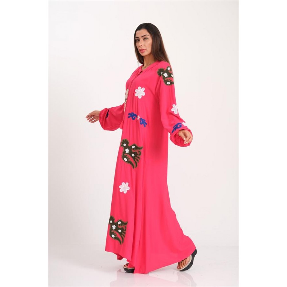 Pembe Sıfır Yaka Önü Ve Kolları Nakışlı Püsküllü Uzun Elbise Pembe
