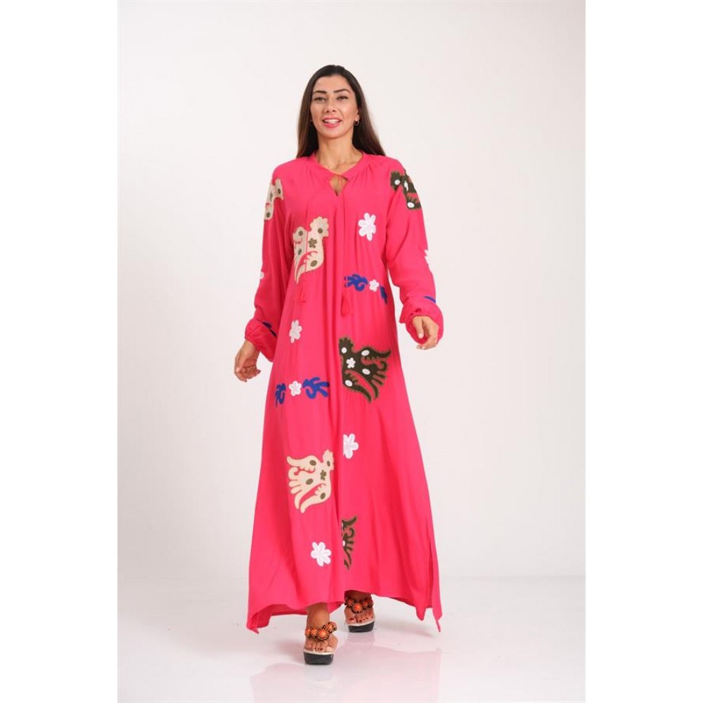 Pembe Sıfır Yaka Önü ve Kolları Nakışlı Püsküllü Uzun Elbise