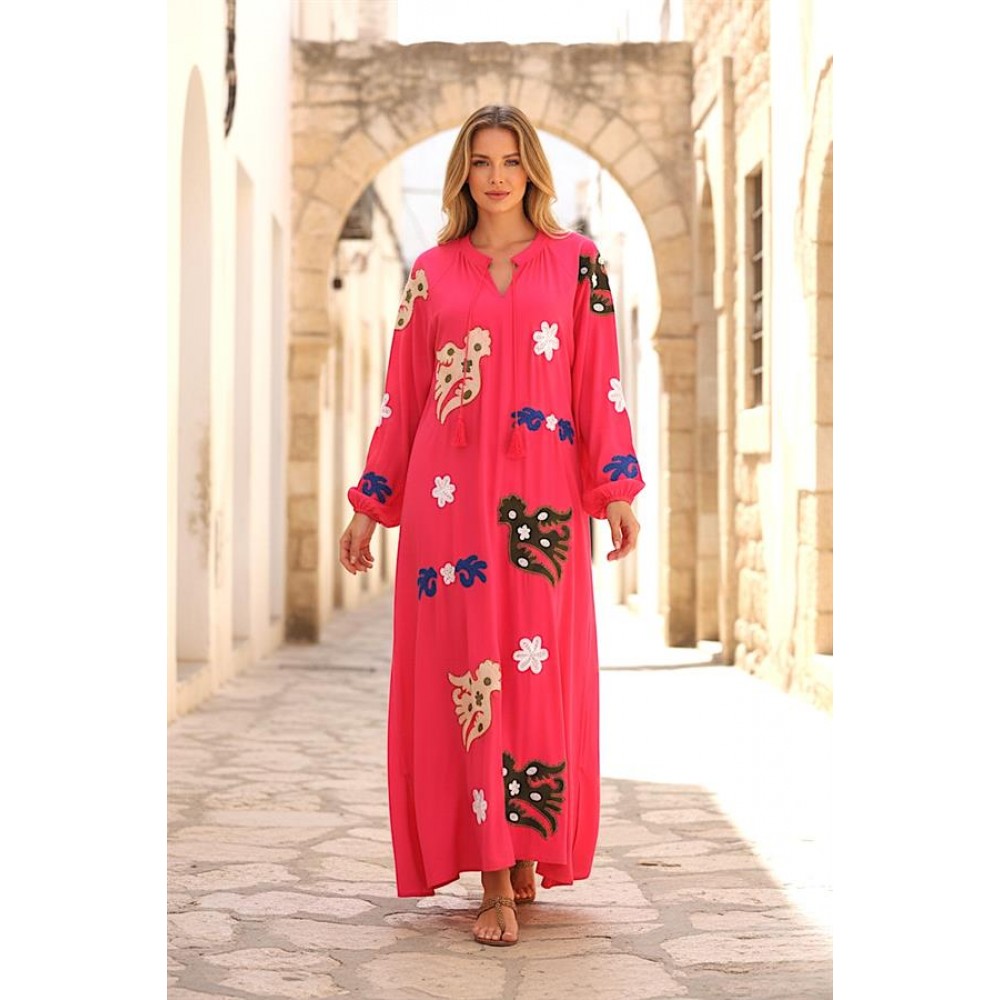 Pembe Sıfır Yaka Önü Ve Kolları Nakışlı Püsküllü Uzun Elbise Pembe EU3YNPX915