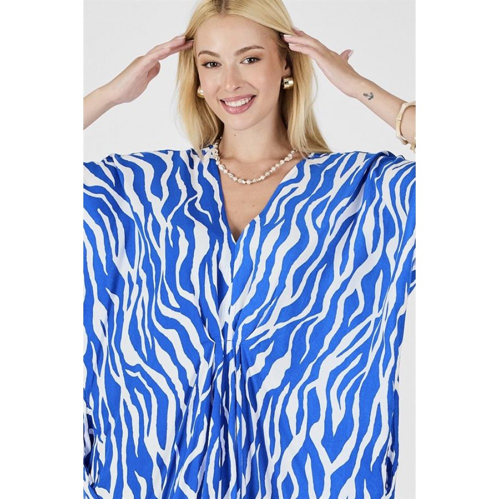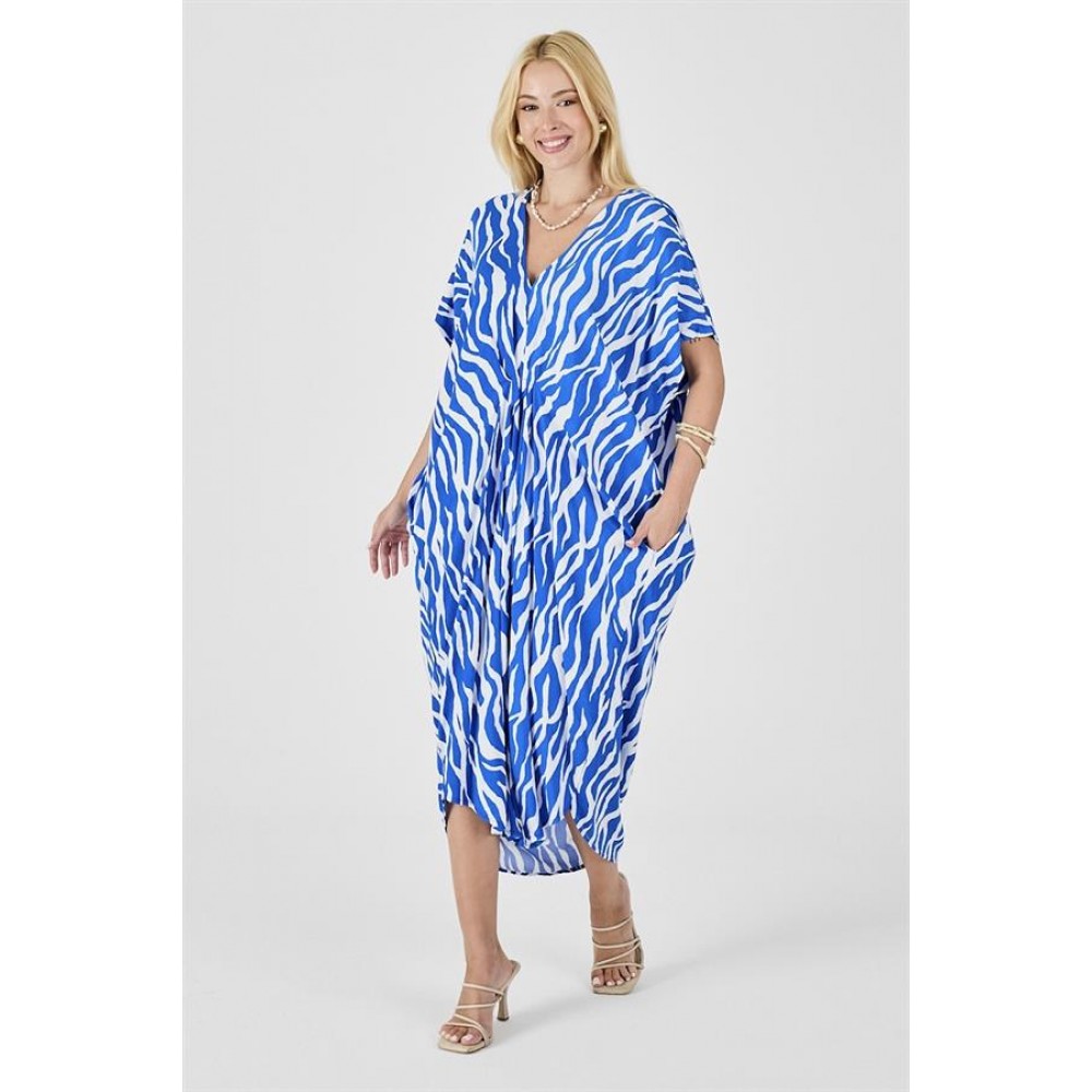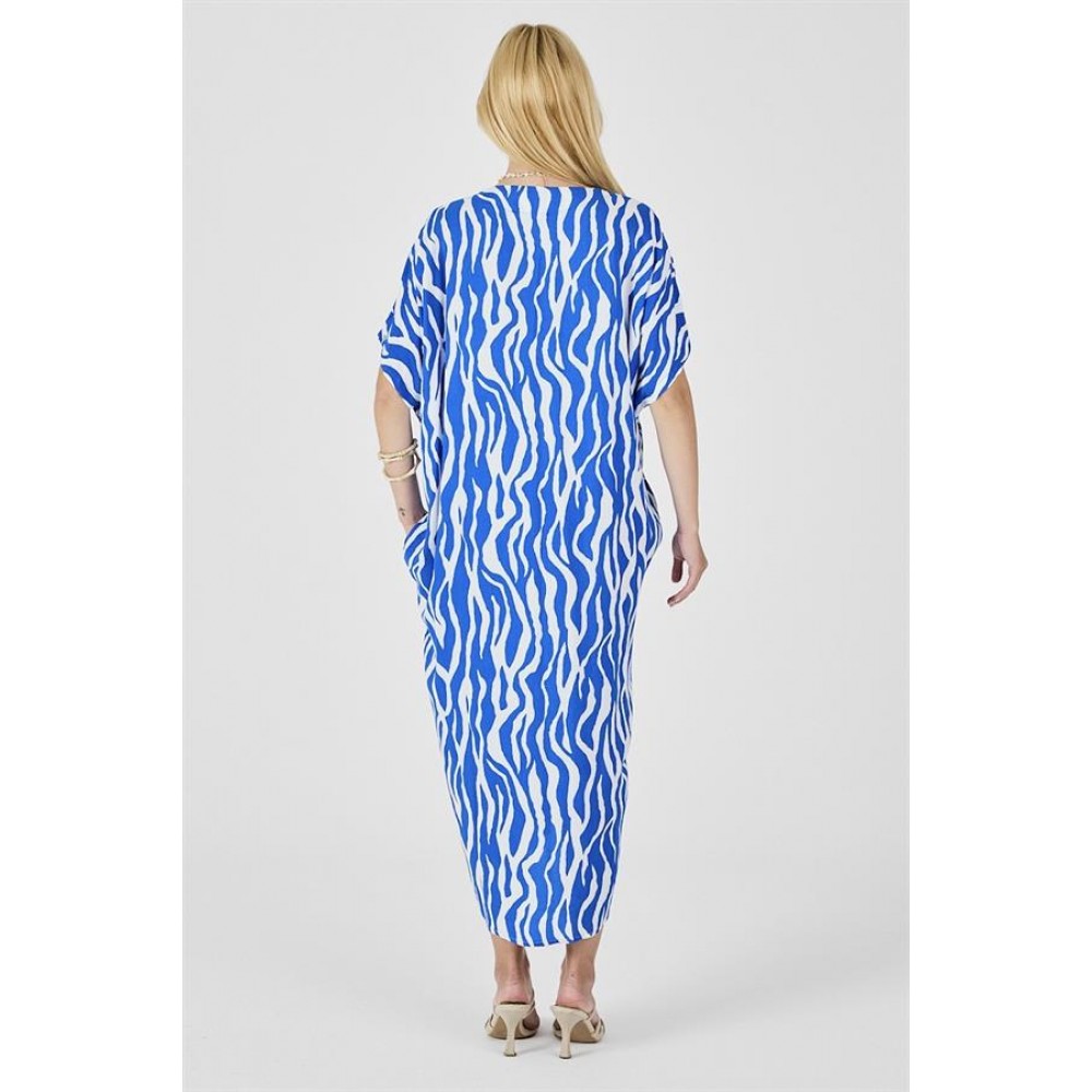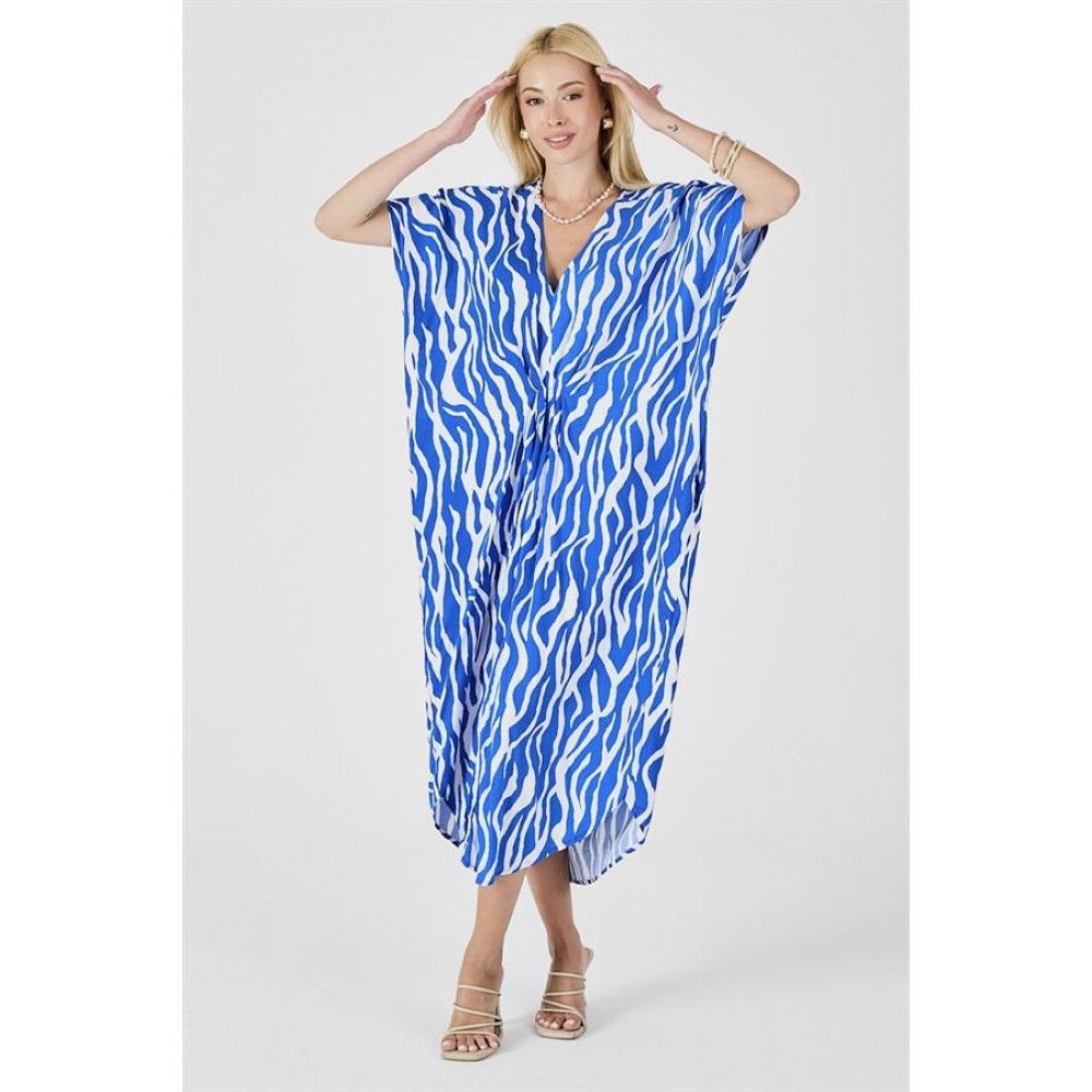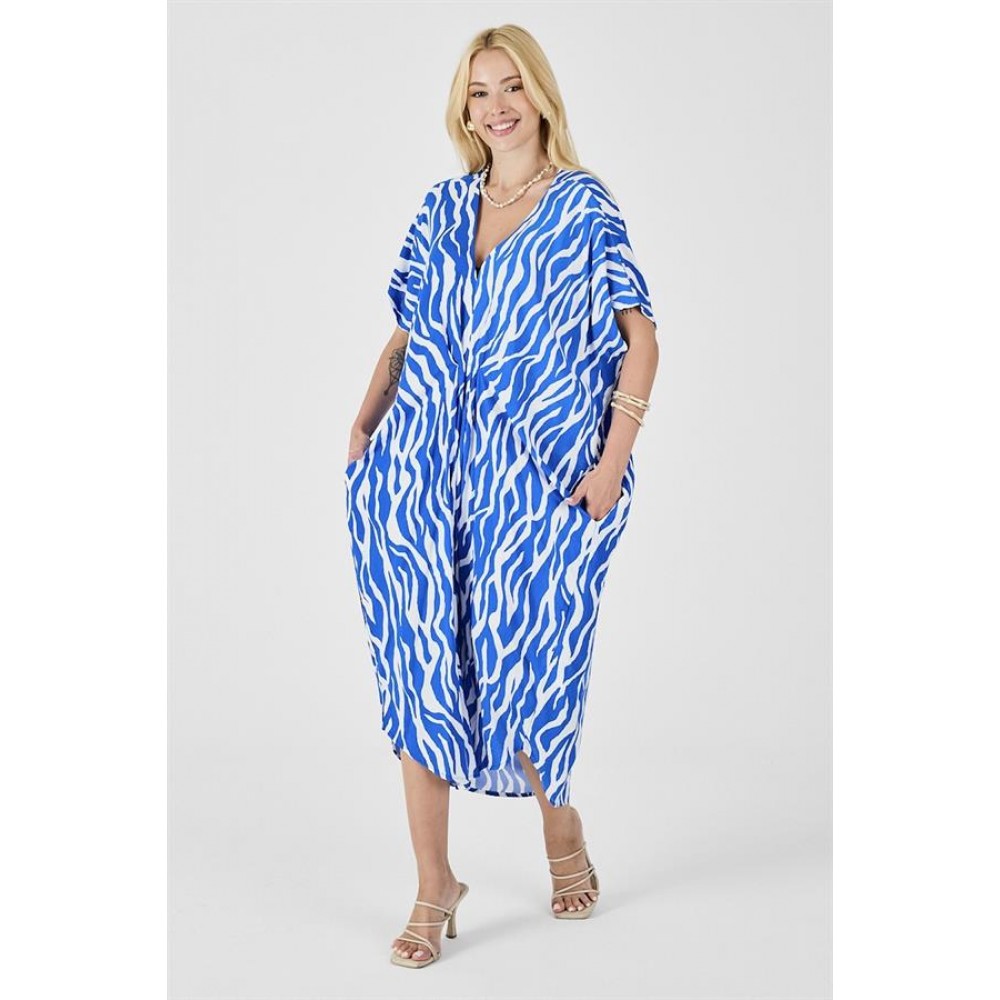 Saks Mavi Desenli V Yaka Tasarım Cepli Elbise