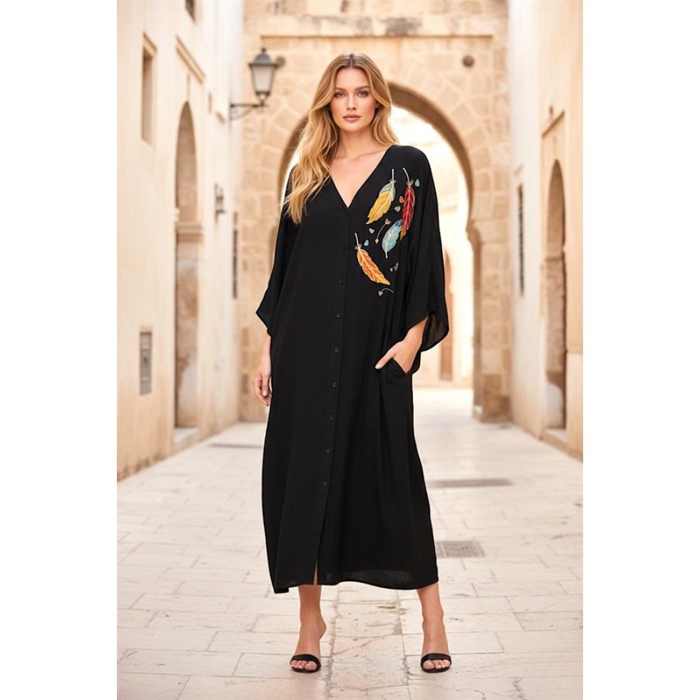 Siyah V Yaka Göğsü Tüy Nakışlı Cepli Oversize Uzun Gömlek Elbise Siyah