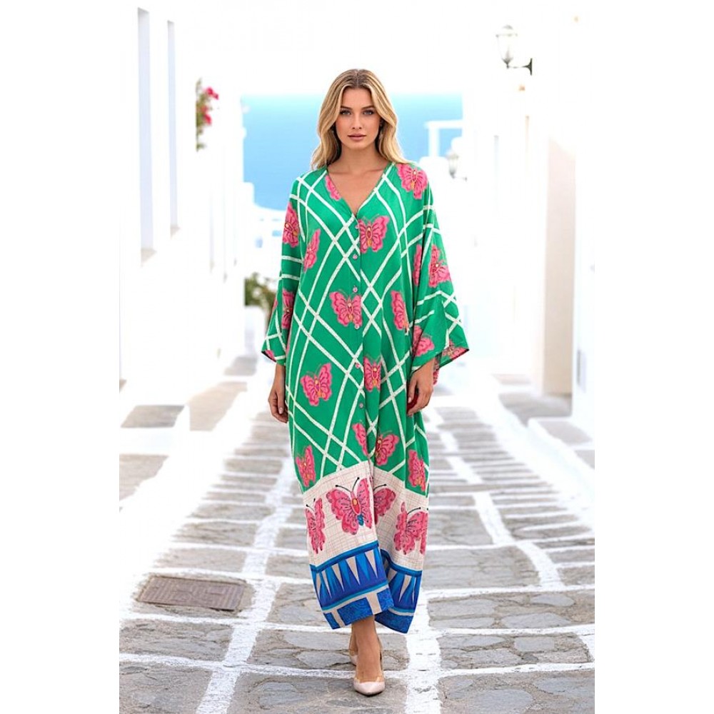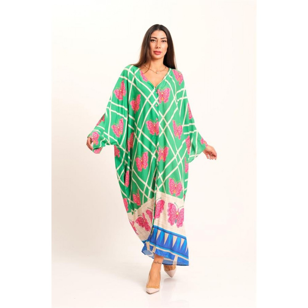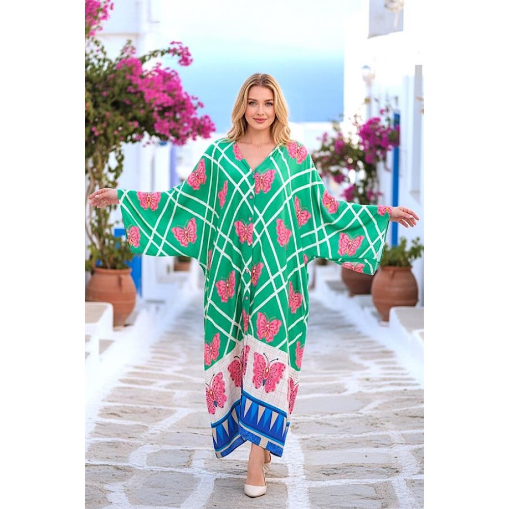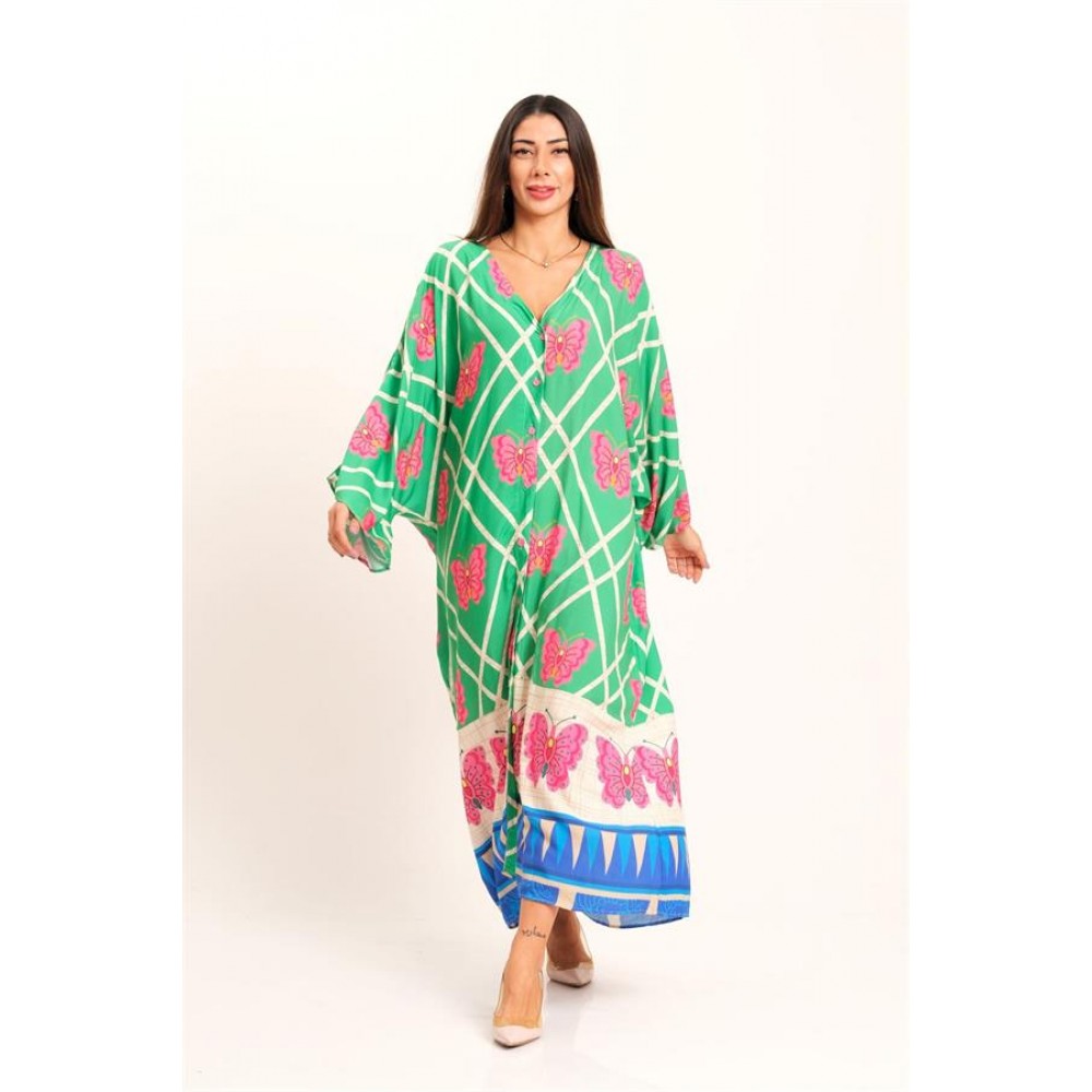 Yeşil Kelebek Desenli V Yaka Yarasa Kol Cepli Oversize Uzun Gömlek Elbise