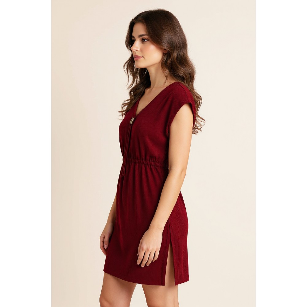 Kadın Bordo Yanları Yırtmaçlı Tokalı V Yaka Mini Plaj Elbisesi